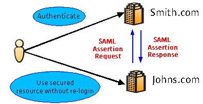 Suppose a user logs in to Smith.com and is authenticated. Later, the same user accesses Johns.com. Without single sign-on, the user would typically have to reenter his user identity information to Johns.com. Under the SAML scheme, by sending an SAML assertion request message, Johns.com can ask Smith.com if the user has already been authenticated. Smith.com then sends back an SAML assertion statement indicating that the user in fact has been authenticated. Once Johns.com receives the SAML assertion statement, it allows the user to access its resources without asking the user to reenter his identity information.