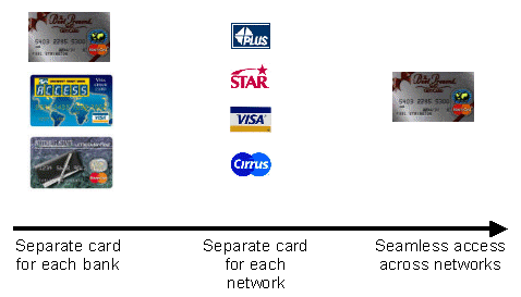 As illustrated in Figure 10, the ATM network serves as an analogy for the federated network. Initially, individual banks issued their own ATM cards, and different banks did not interoperate. At this stage, you could not use your ATM card in an ATM machine owned and operated by another bank. These days, you can use your credit card or ATM card in any ATM machine, as long as the bank that owns the machine and your bank are members of the same affiliation network. In the not too distant future, it is not a stretch to think about a single global network to which all banks directly or indirectly belong. The identity network should evolve similarly.