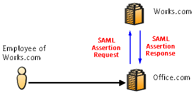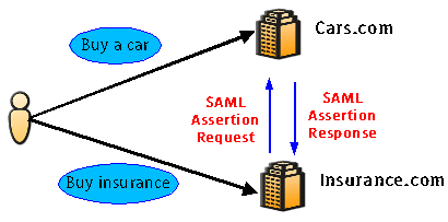 In this case, let's say a user buys a car from Cars.com. The same user then decides to buy automobile insurance from Insurance.com. Now, when the user goes to Insurance.com to buy insurance, the user's profile such as name, address, and credit history, which Cars.com has already collected, can pass to Insurance.com. In this case, Insurance.com sends an SAML assertion request, such as, "Send me user profile information," to Cars.com, and Cars.com sends all the user profile information it knows to Insurance.com in SAML assertion statements.