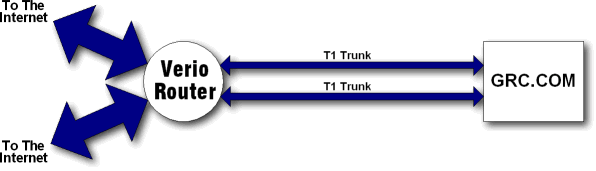 traffic and valid traffic was unable to compete with the torrent. At our end of our T1 trunks, our local router and firewall had no trouble analyzing and discarding the nonsense, so none of our machines were adversely affected. But it was clear that this attack was not attempting to upset our machines, it was a simple brute force flood, intended to consume all of the bandwidth of our connection to the Internet . . . and at that it was succeeding all too well. Gibson Research Corporation is connected to the Internet by a pair of T1 trunks. They provide a total of 3.08 megabits of bandwidth in each direction (1.54 megabits each), which is ample for our daily needs. |