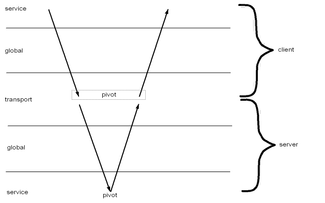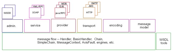 The following diagram shows the layering of subsystems. The lower layers are independent of the higher layers. The 'stacked' boxes represent mutually independent, although not necessary mutually exclusive, alternatives. For example, the HTTP, SMTP, and JMS transports are independent of each other but may be used together.